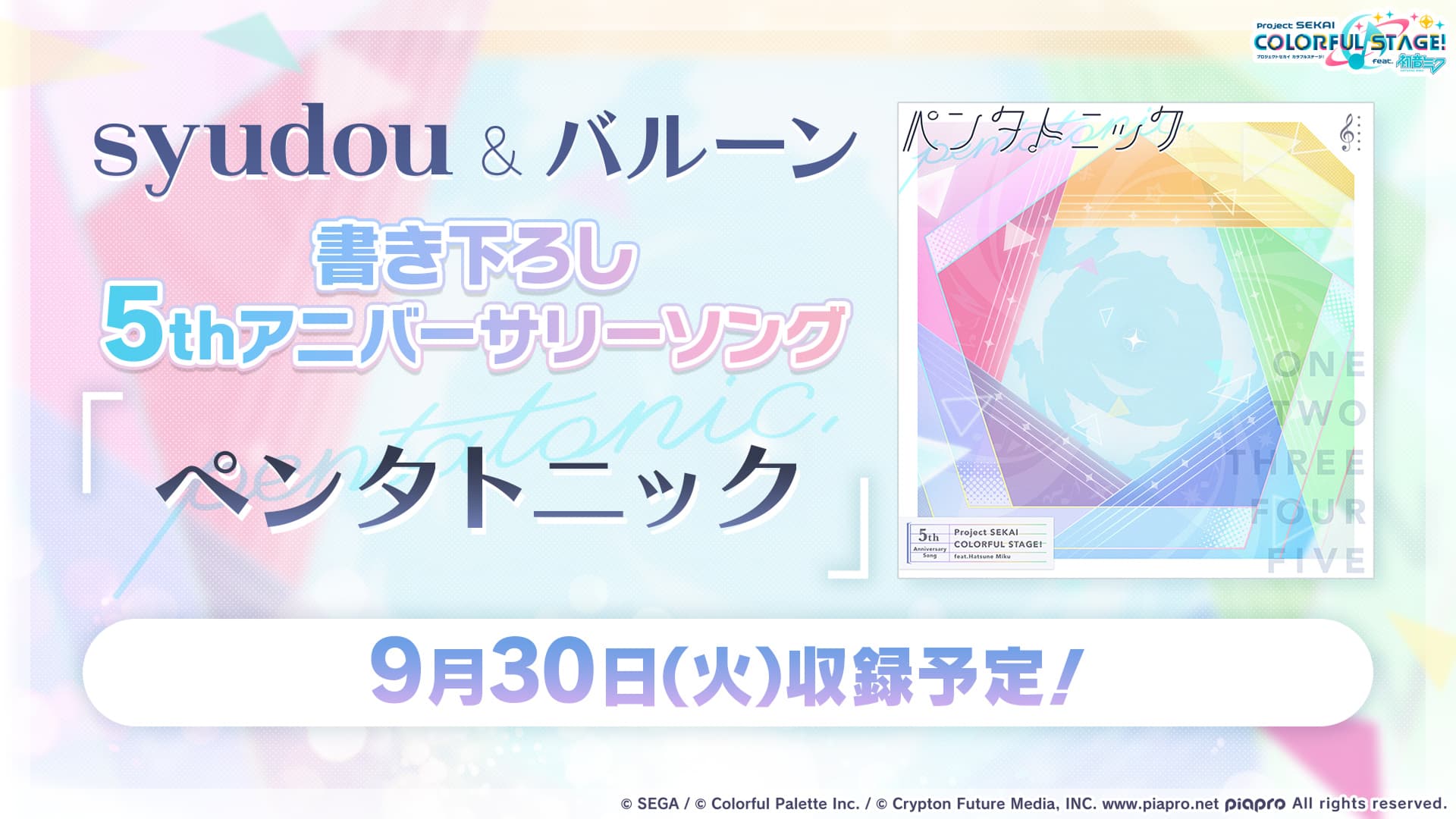 5thアニバーサリーソング「ペンタトニック」収録決定 syudouさんとバルーンさんが制作する5thアニバーサリーソング「ペンタトニック」の実装が決定!さらに、6ユニットそれぞれの歌唱ver.も追加されます。