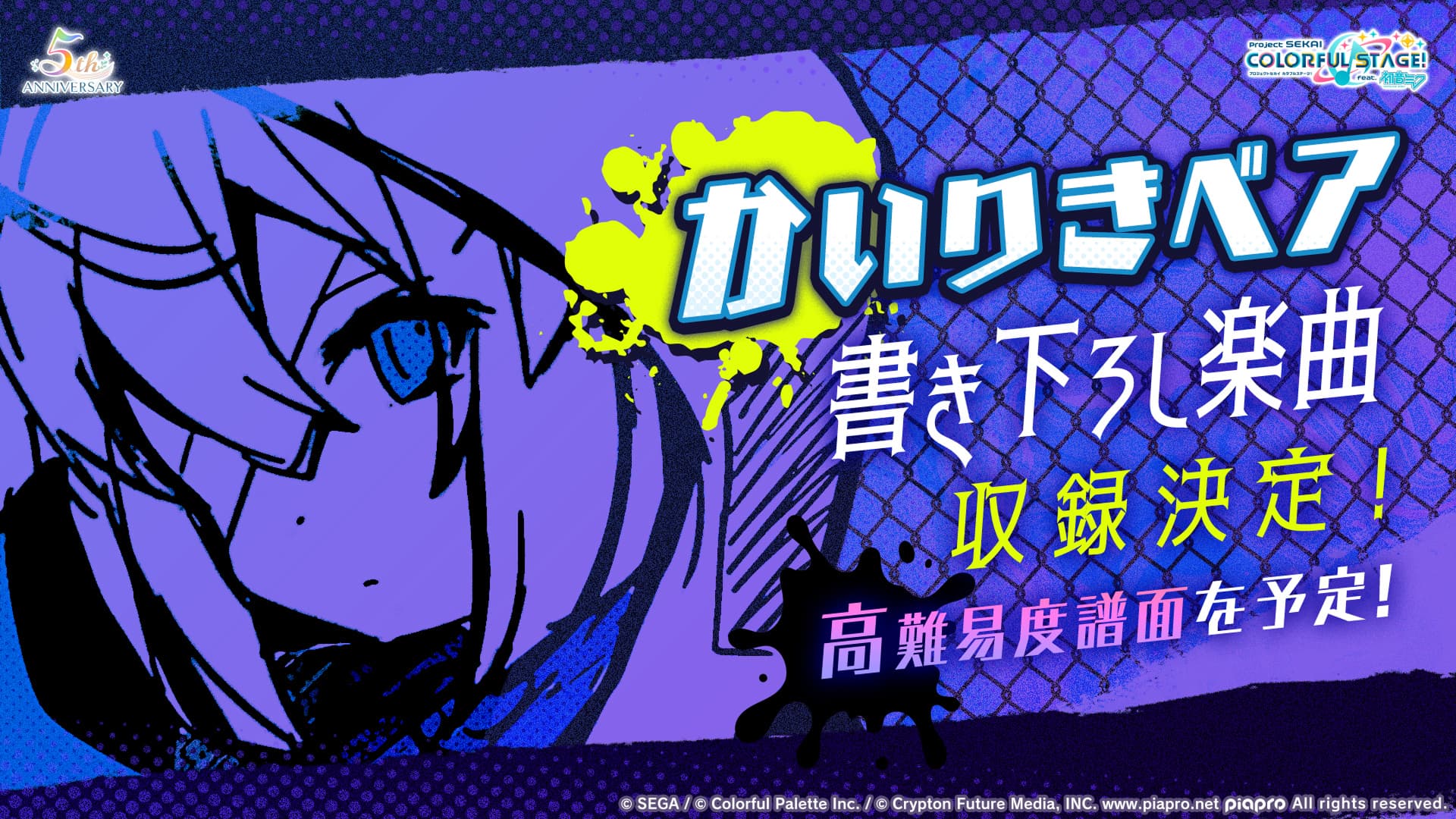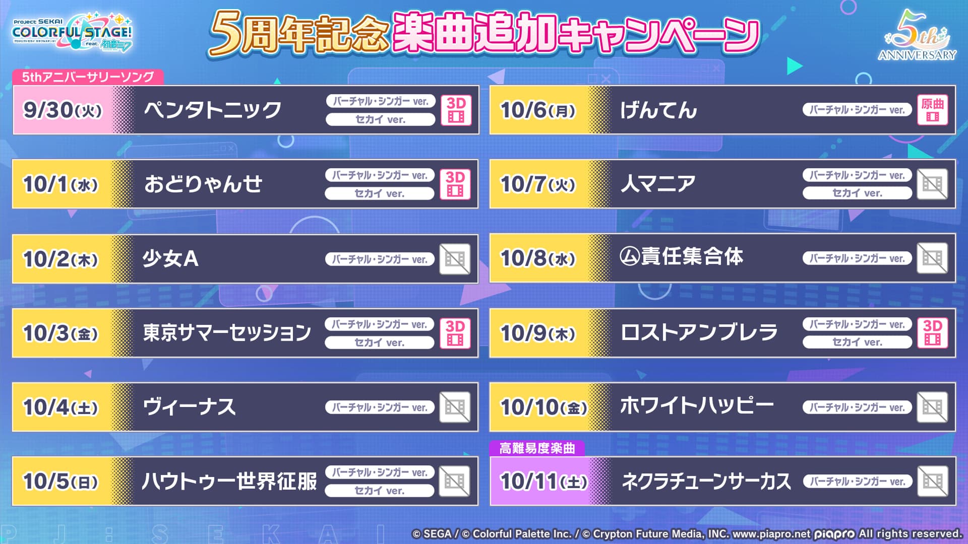 楽曲追加キャンペーン 「5周年記念楽曲追加キャンペーン」の開催が決定!以下の楽曲がゲーム内に収録されます。おどりゃんせ / ユリイ・カノン少女A / 椎名もた東京サマーセッション / HoneyWorksヴィーナス / ナナホシ管弦楽団ハウトゥー世界征服 / Neruげんてん / 大漠波新人マニア / 原口沙輔㋰責任集合体 / マサラダロストアンブレラ / 稲葉曇ホワイトハッピー / MARETU